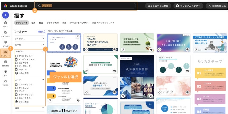 上部の検索窓に「スライド」と入力し、表示されたテンプレートのうち使いたいデザインのテンプレートをクリックして、編集画面に移動してください。 「フィルター」>「スタイル」「ムード」で作りたいイメージに合わせてチェックを入れると、それらのジャンルに沿ったテンプレートが表示されます。