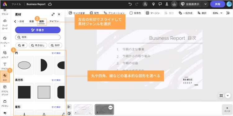 「素材」>「図形」から、丸や四角、線などの基本的な図形を選べます。