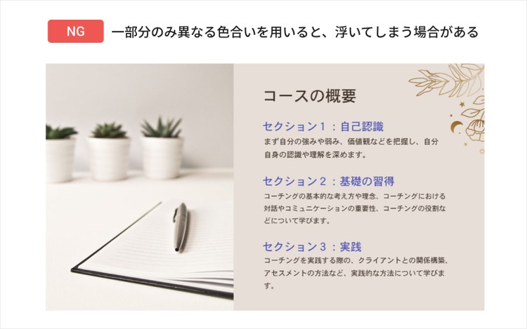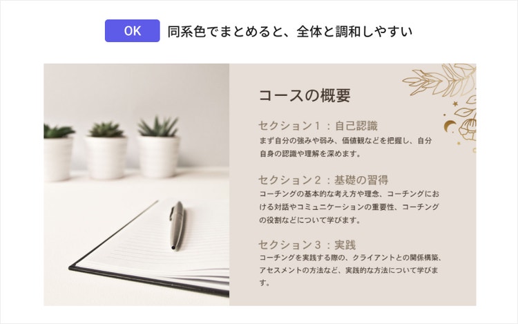 複数の色を使いたい場合は、似た色から選ぶと、デザインの雰囲気を保ちやすくなります。例えば、以下のNG例のスライドでは、青色の文字がデザインから浮いた印象を受けます。