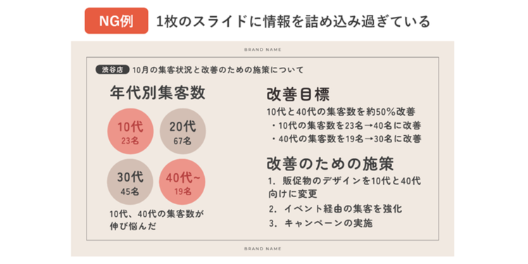 例えば、以下のように1枚のスライドで「年代別集客数」「改善目標」「施策」という3種類の情報を伝えようとすると、文字が小さくなり余白も取りにくくなります。その結果、ごちゃごちゃした見た目になるだけでなく、重要な情報が目立たず、内容の理解が難しくなります。