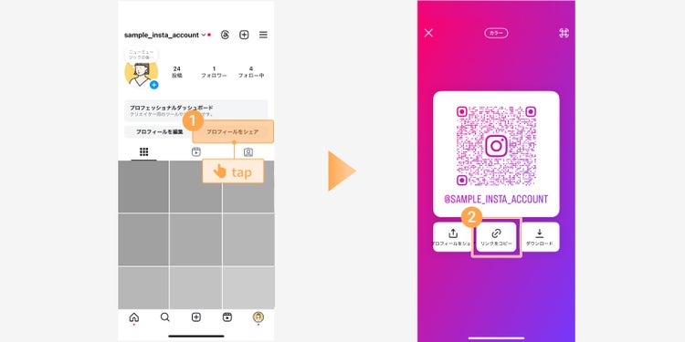 Instagramアプリを開き、自分のプロフィールページから「プロフィールをシェア」をタップするか、「アイコン写真」>「QRコード」の順にタップします。