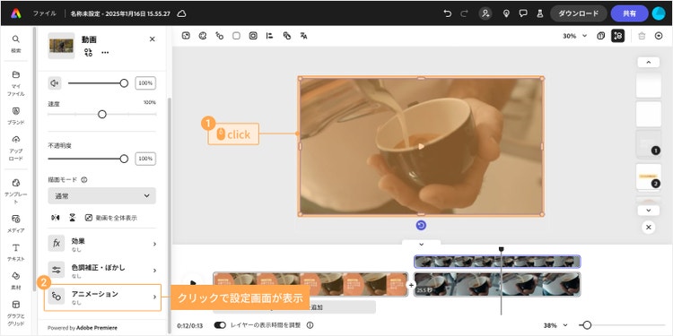 2つの動画をつなぐ際には「アニメーション」を使うと、自然なつながりを演出できます。Adobe Expressには豊富なアニメーションが用意されています。使いたい効果を選ぶだけで、カンタンに利用できます。