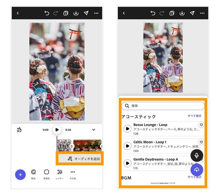 TikTokアプリではBGMを途中で切り替えることはできませんが、Adobe ExpressではシーンごとにBGMを変えたり、オープニングとエンディングを分けたりと、複数のBGMを付けられます。