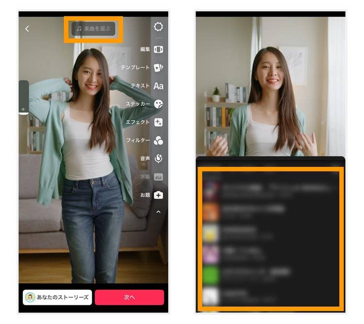 画面上部の「楽曲を選ぶ」をタップすると、TikTok内で使用できる楽曲が表示されます。好きな曲を選んで追加してください。