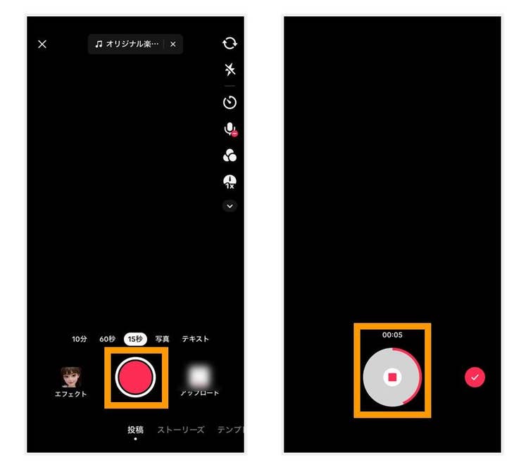 撮影を開始するには、TikTokアプリを起動し「+」をタップします。画面左下に表示される撮影時間の選択肢から、好きな撮影時間を選んでください。