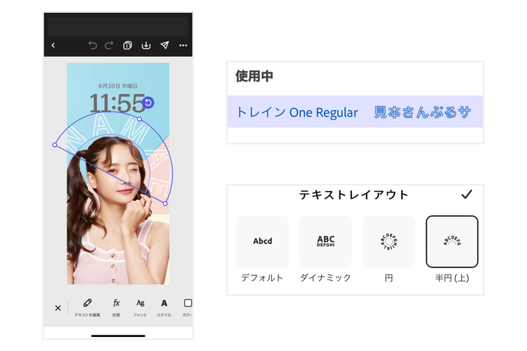 今回は推しの名前を想定して「トレイン One」という無料フォントを使ってテキストを配置しました。顔まわりに沿うよう「半円(上)」を使えば、ちょっとしたポイントにもなります。