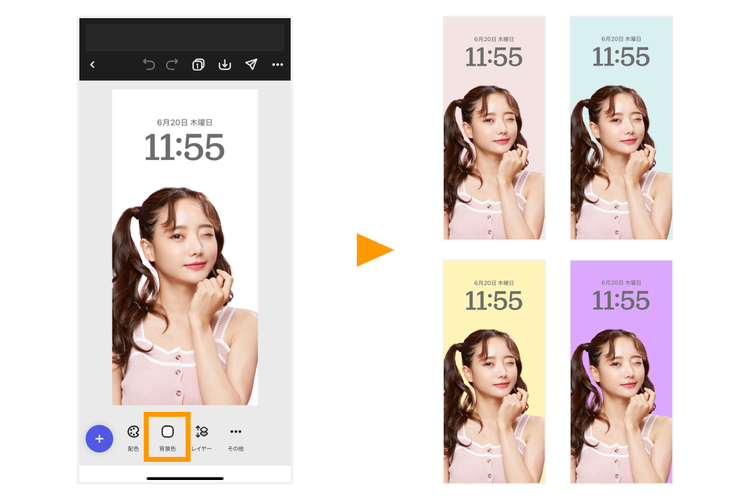 背景色を変更したい場合は、ツールバーの「背景」をタップします。「おすすめ」に表示された色から選んだり、「カスタム」や「別のカラーを追加」で好きな色を指定したりできます。推しの担当カラーを選ぶのもオススメですよ。