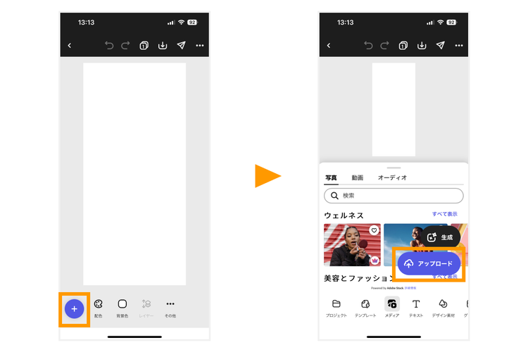 「+」ボタン→ツールバーから「メディア」を選択し、「アップロード」をタップします。