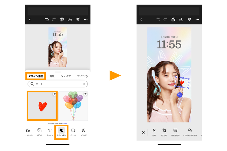 ツールバーの「デザイン素材」から、「デザイン素材」のタブを選択し、検索窓でお目当ての素材を探しましょう。素材をタップして大きさや角度を調整して配置してください。