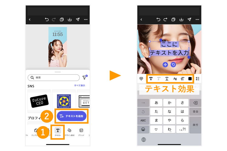 推しの名前やグループ名などを入れたい場合は、「テキスト→テキストを追加」の順にタップしましょう。テキストボックスが表示されたら好きな文字に変更してください。フォント種類や色(テキスト効果)の変更などは、入力キーの上部から行えます。