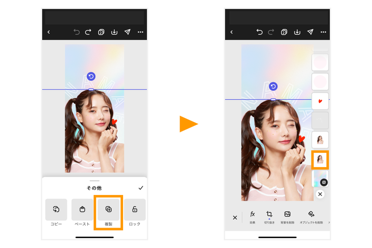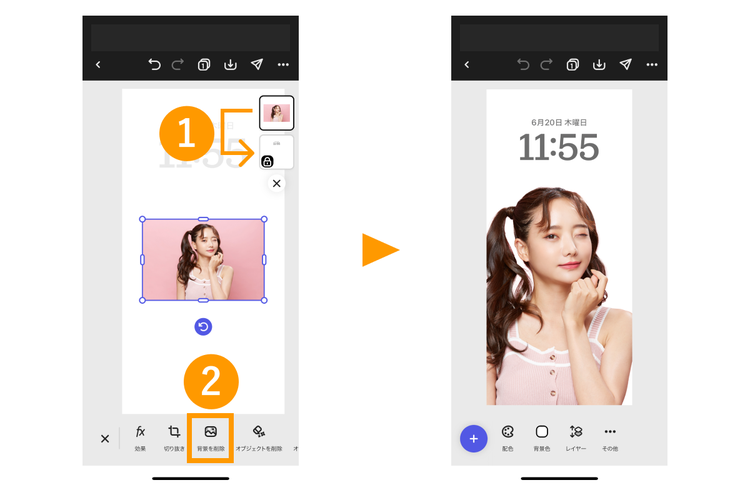 します。画像をアップロードしたら、「レイヤー」をタップして、ガイド画像よりも重なり順を下にしましょう。順番を変更できたら「背景を削除(期間限定で無料)」をタップして背景を削除してください。背景を削除できたら、大きさや位置を調整しましょう。