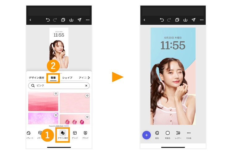 背景画像を設定すると、さらに華やかにできます。「デザイン素材」メニューから「背景」タブを選択し、背景に使いたい素材を検索しましょう。気になる素材をタップすれば、自動的に背景に適用されます。