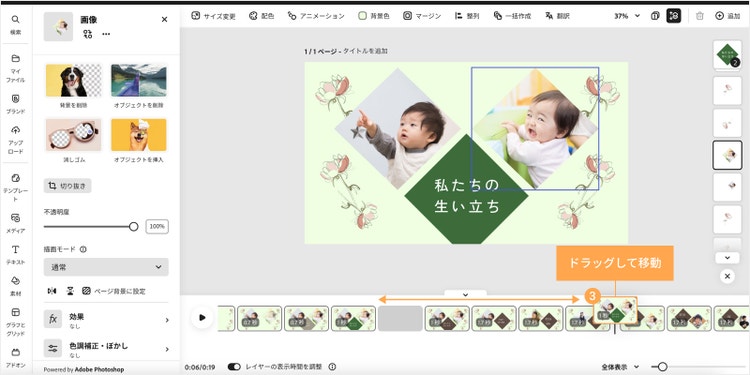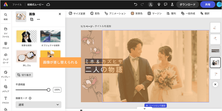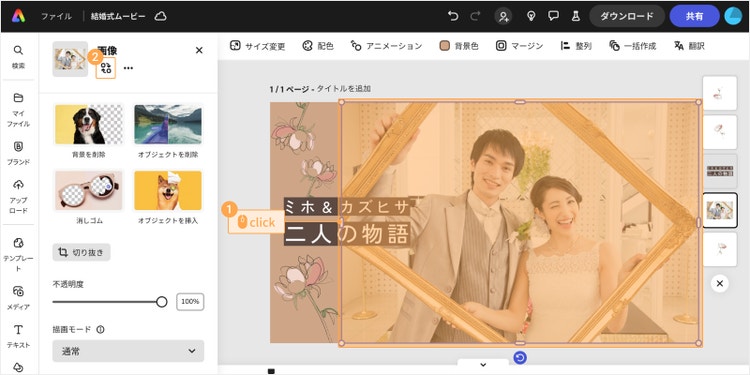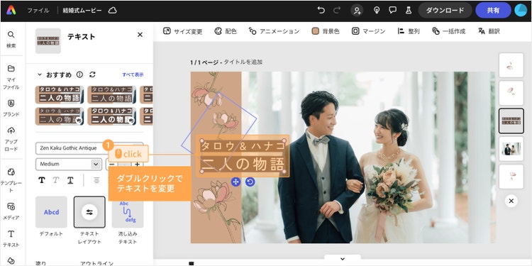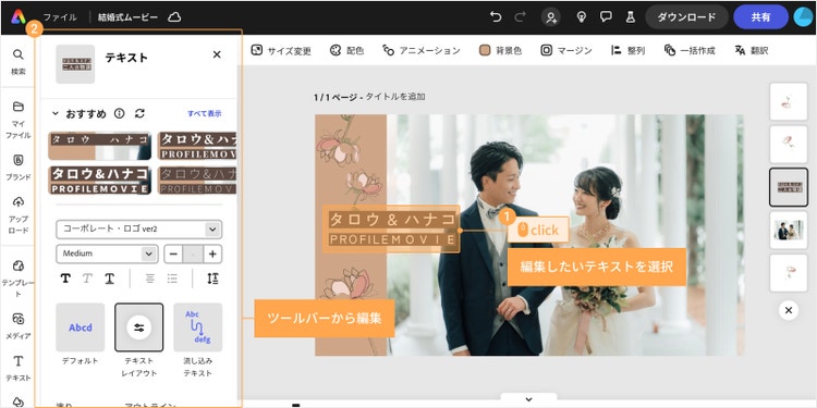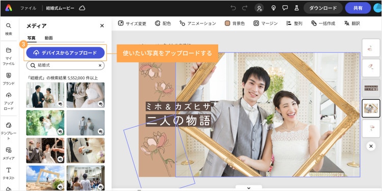 使いたいテンプレートが決まったら、Adobe Expressで結婚式用のムービーを自作してみましょう。ここでは、PCでの操作手順をご紹介しますが、Adobe Expressのアプリを使えばスマホで編集することも可能です。