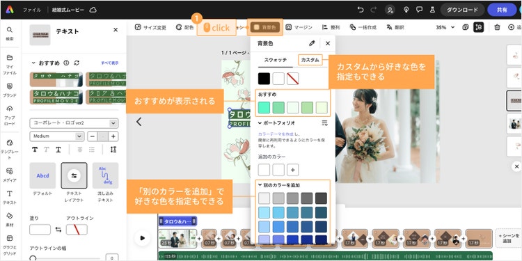 上部の「背景色」をクリックすると、背景色の編集ツールが表示されます。結婚式用ムービーのイメージに合う背景色を、「おすすめ」の色から選んだり、「カスタム」や「別のカラーを追加」で色を指定したりしましょう。