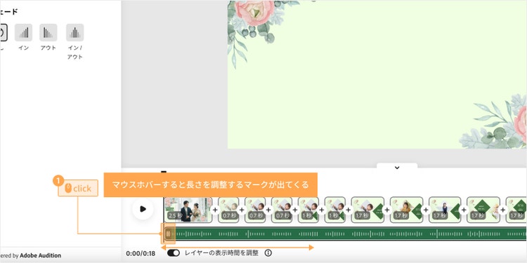 写真や文字、装飾などレイヤーの表示タイミングを変更したい場合、まずは下部の「レイヤーの表示時間を調整」をオンにします。