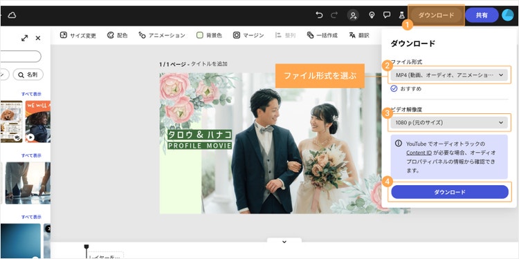 ムービーが完成したら、画面右上の「ダウンロード」をクリックし、「MP4」のファイル形式を選んでダウンロードしましょう。