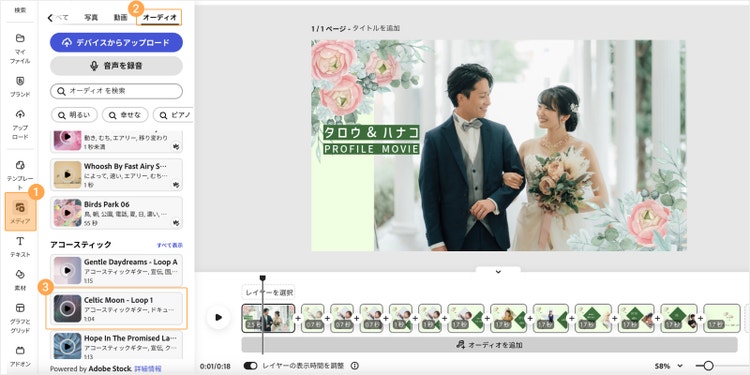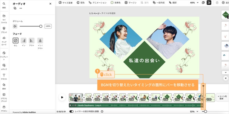 次に、ツールバーから「メディア」を選択し、「オーディオ」タブをクリック。イメージに合うBGMを選んでください。