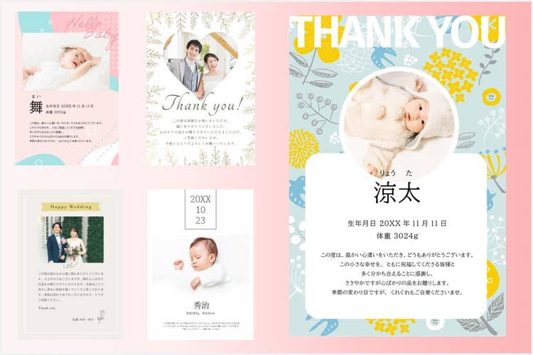 Adobe Expressにはプロフィールムービーのほか、「招待状」「席次表」「サンクスカード」など、結婚式でよく使われるアイテム専用のテンプレートが揃っています。どれもプロのデザイナーが手がけているので、テキストや画像をアレンジするだけで、カンタンにおしゃれなアイテムが完成。