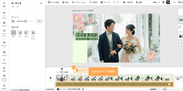 写真以外の素材やBGMはすべてAdobe Express内にあるものを使用しました。カンタンな操作で自分たちらしいオリジナルなムービーが作成できるので、ぜひオープニングやエンディングムービーも自作してみてください。