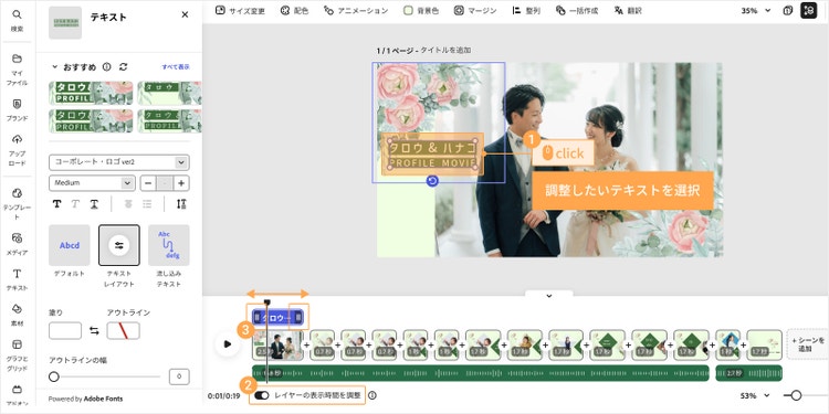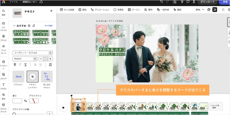 次に、調整したいレイヤーを選択します。ここでは、「タロウ&ハナコ PROFILE MOVIE」という文字を調整してみます。テンプレート内の文字を選択すると、新しいタイムラインが表示されます。その青色のバーを左右に伸縮すると、表示するタイミングや長さを変更できます。