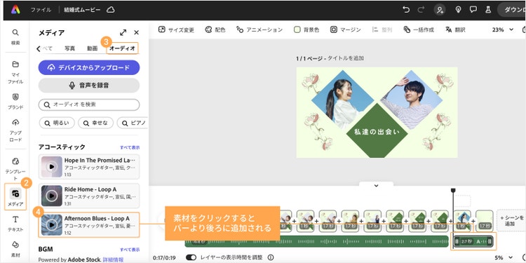 先ほどの手順同様、「メディア」から「オーディオ」タブをクリックするとBGMを検索できます。追加するBGMが決まったら、該当のBGMをクリックすれば、タイムラインに追加されます。