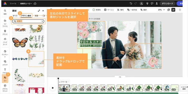 次に「デザイン素材」を選択します。この項目では、イメージ画像を検索できます。今回は「結婚式」というキーワードで検索し、花のモチーフを追加してみました。