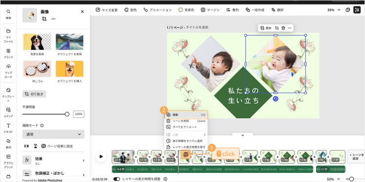 まずは、既存の画像を自分たちの写真に変更してみましょう。既存の画像を選択した状態で、「置換」マークをクリックします。