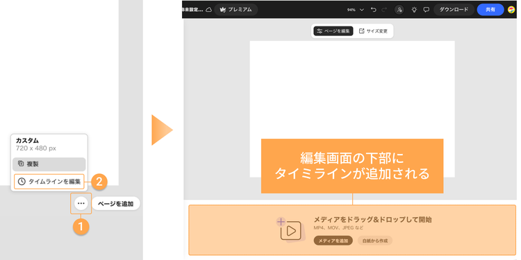 カンバスが開いたら、右下の「…」から「タイムラインを編集」を押してください。