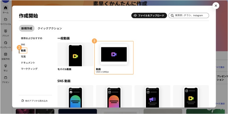 Adobe Expressのトップページにアクセスできたら、「+」ボタンをクリックし、「一般動画」→「動画」を選択します。