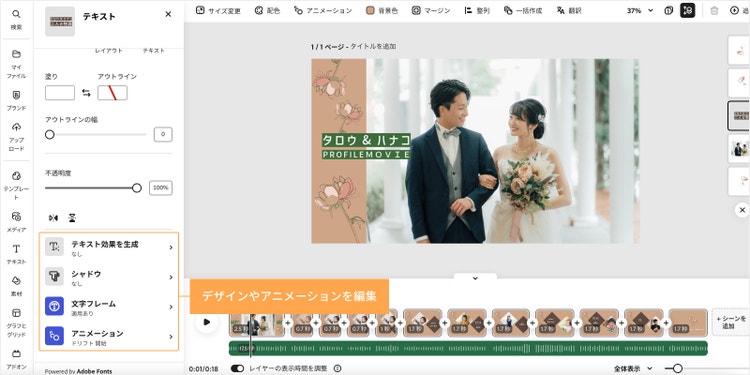 テキストのデザインやアニメーションを編集したい場合は、ツールバーから編集したい項目を選んで調整してください。