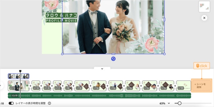 シーンを追加したいときは、タイムライン右側の「+シーンを追加」をクリックしてください。
