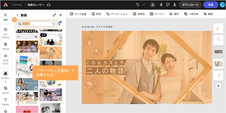 次に検索窓に「結婚式」や「wedding」と入力して検索します。結婚式用のムービーに使えるテンプレートが一覧で表示されるので、作りたいイメージと近いものを選び、クリックして編集画面に移動しましょう。今回はアニメーションのテンプレートを使って解説します。