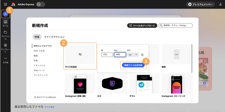 それ以外のアスペクト比で作りたい場合は、「+」ボタンから「サイズを指定」を選択して、サイズを数値で指定し、「新規ファイルを作成」をクリックしましょう。