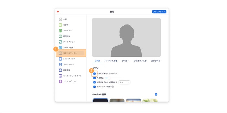 Zoomでは、バーチャル背景が相手側にどのように表示されているかをチェックできます。 Z oomの「背景とエフェクト 」を開き、「マイビデオをミラー」のチェックを外すと相手に見えている映像が表示されます。 このとき、設定した背景画像が反転していなければ問題ありません 。