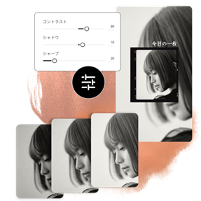 調整メニューを使えば、モノクロ画像をより鮮明にできます。コントラストや明るさを調整することで、より印象的な仕上がりに。シャープを調整すれば、ぼやけた画像もくっきりします。思いどおりの画像になるまで、様々なメニューを組み合わせて自由に編集してみましょう。