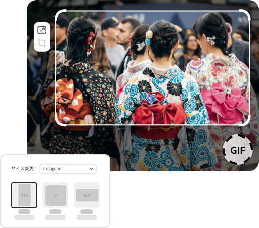 GIFの縦横比を変更できるので、どのような公開先にも最適化できます。正方形、横長、縦長のフレームから選んだら、GIF画像をドラッグして新しい形に合わせましょう。