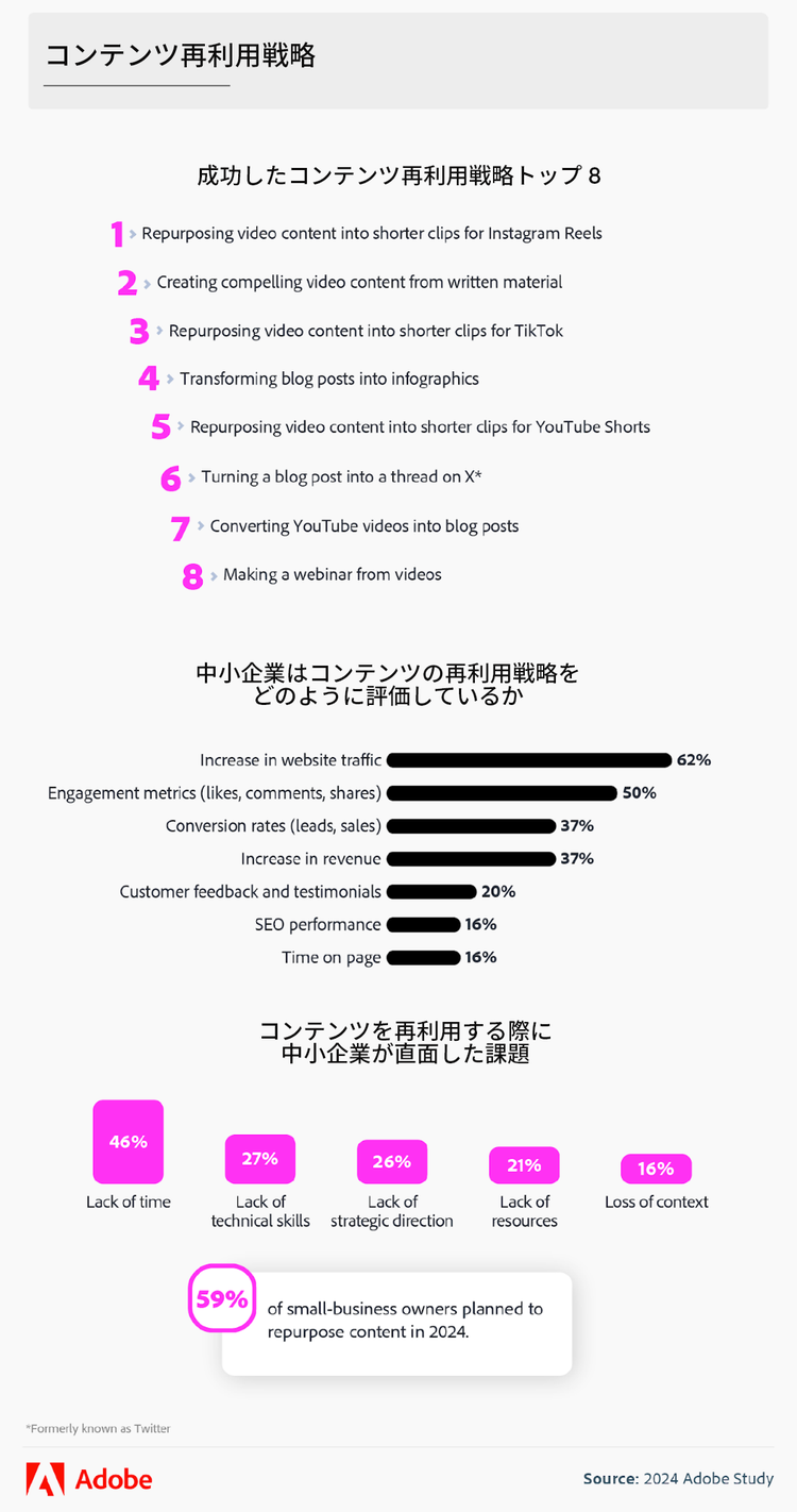 コンテンツ需要がますます高まる中、クリエイターは短期間でより多くのコンテンツを制作するプレッシャーにさらされています。こうした状況で、中小企業の経営者は、既存コンテンツを再利用することで時間とコストを節約する方法を取り入れています。今回、517名の経営者を対象に、コンテンツ再利用に使用している戦略やツール、それがブランド認知やエンゲージメント、売上にどのように影響しているかを調査しました。