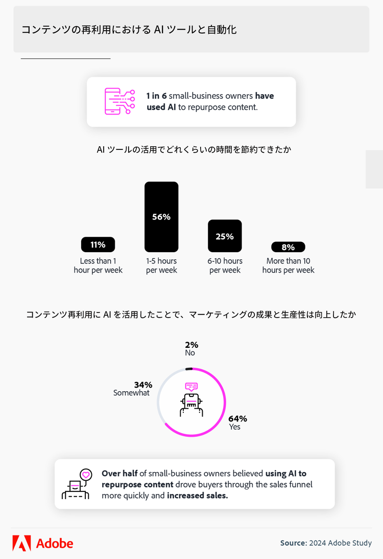 - 中小企業経営者の6人に1人が、コンテンツ再利用にAIを利用している