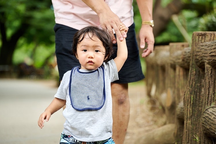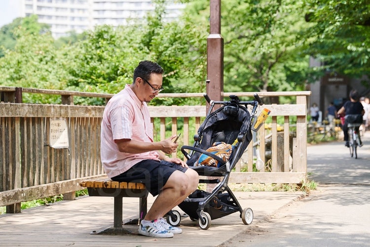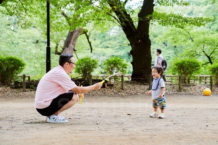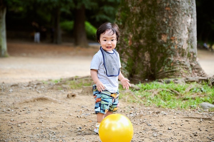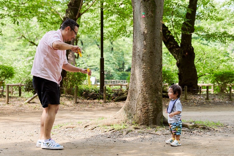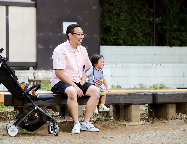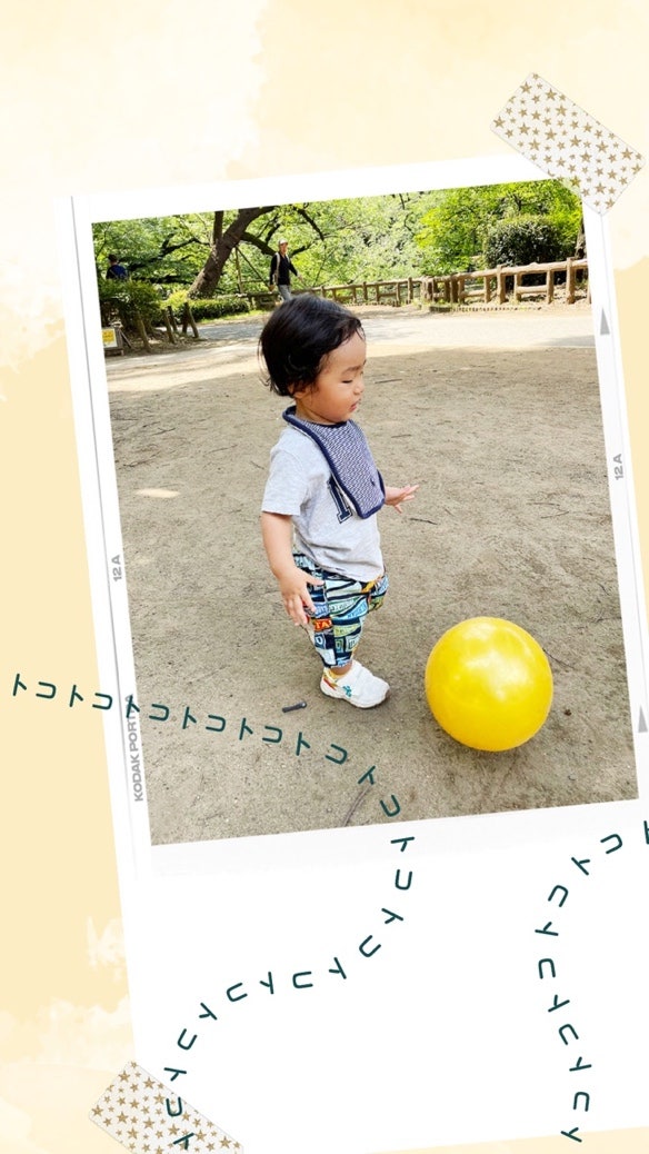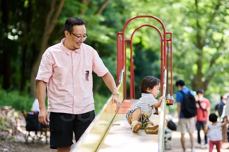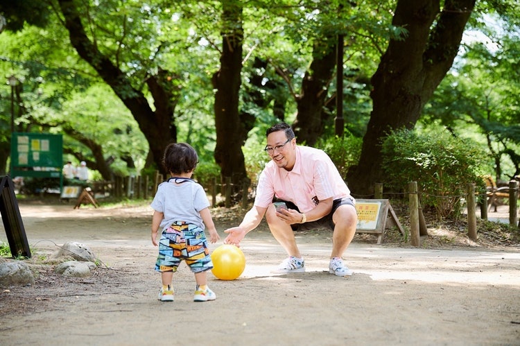 「ここには散歩にもよく来ますし、どこかに出かけるときに通ったりもしますね。彼は家では絵本を読んでもらうのが大好きだったりと、落ち着いた面もあるのですが、最近、公園ではよく歩く。とにかく好きなように歩きたい、というやる気と好奇心を感じるので思いのまま歩かせています。今日は写真を撮りたいので、多少のおもちゃやシャボン玉を持ってきたけど興味もってもらえるかなあ(笑)」