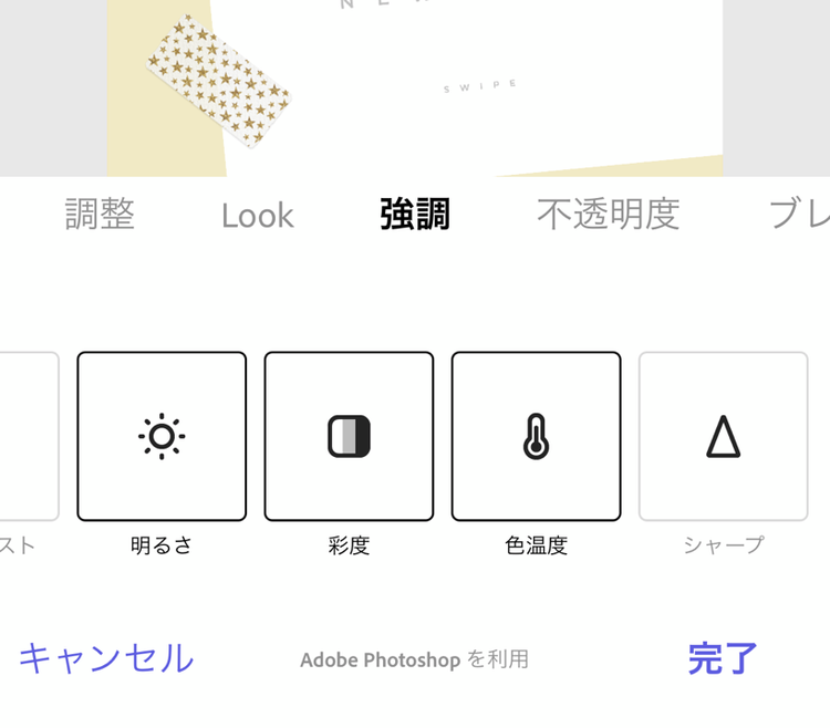 ここで、下部の「強調」を選択したら、「明るさ」や「彩度」などを調整して、写真をクリアで、さわやかな色味に調整していきます。Adobe Express上でこのような写真の色調補正までトータルに行えるので便利です。