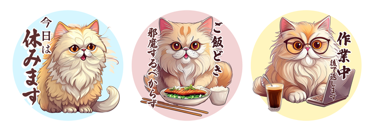 - 食事中のペルシャねこ、魚定食、箸、幸せそう、漫画風、白い背景
