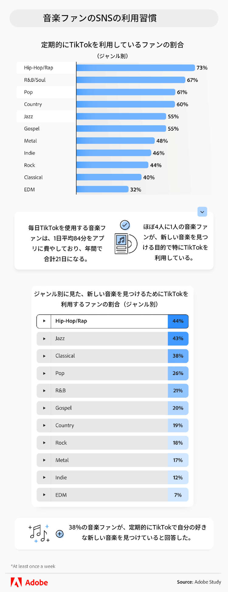 ヒップホップ/ラップのファンは、TikTokで新しい音楽を見つけることに特に積極的で、59%が「よくTikTokでお気に入りの楽曲を発見している」と回答しました。