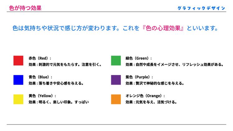 また、赤は「情熱」、青は「誠実」といったように、色がもつ心理的効果を理解し、伝えたい自分のイメージに合わせて色を選ぶことで、より効果的な自己PRにもつなげられるそうです。