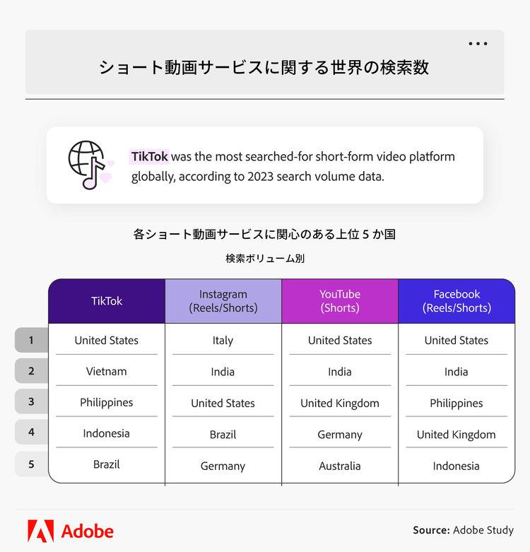 - 2023年のデータによると、TikTokは世界で最も検索されているショート動画サービス