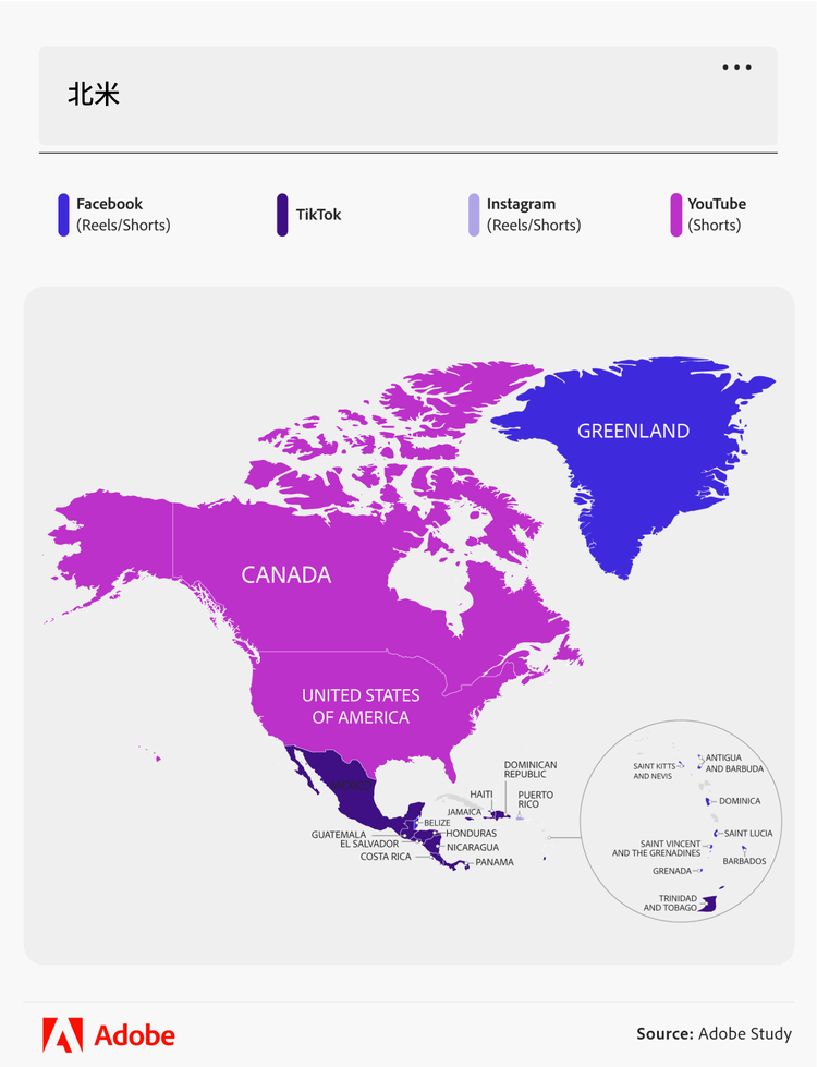 次の調査では、各国ごとに最も検索されたショート動画サービスを地図で示しました。各国の検索数を世界平均と比較し、それぞれの国で最も検索されているサービスを特定しています。