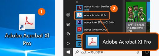 1 デスクトップのAcrobatショートカットアイコン❶を確認するか、ま たはスタートメニューから「すべてのアプリ」→「Adobe Acrobat XI Pro」❷でバージョンを確認できます。