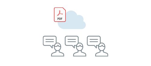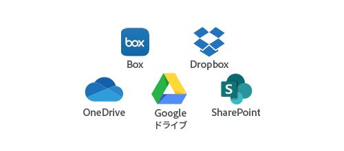 AcrobatのインターフェイスからBox、 Dropbox、Googleドライブ、Microsoft OneDrive またはSharePointアカウントのファイルに直接 アクセスし、デバイスまたはユーザー間で簡 単に共有できます。