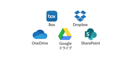 AcrobatのインターフェイスからBox、Dropbox、Googleドライブ、Microsoft OneDriveまたはSharePointアカウントのファイルに直接アクセスし、デバイスまたはユーザー間で簡単に共有できます。