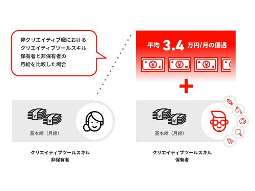 クリエイティブツールスキル保有者には、非保有者よりも月給を「3.4万円程優遇できる」ことが判明。