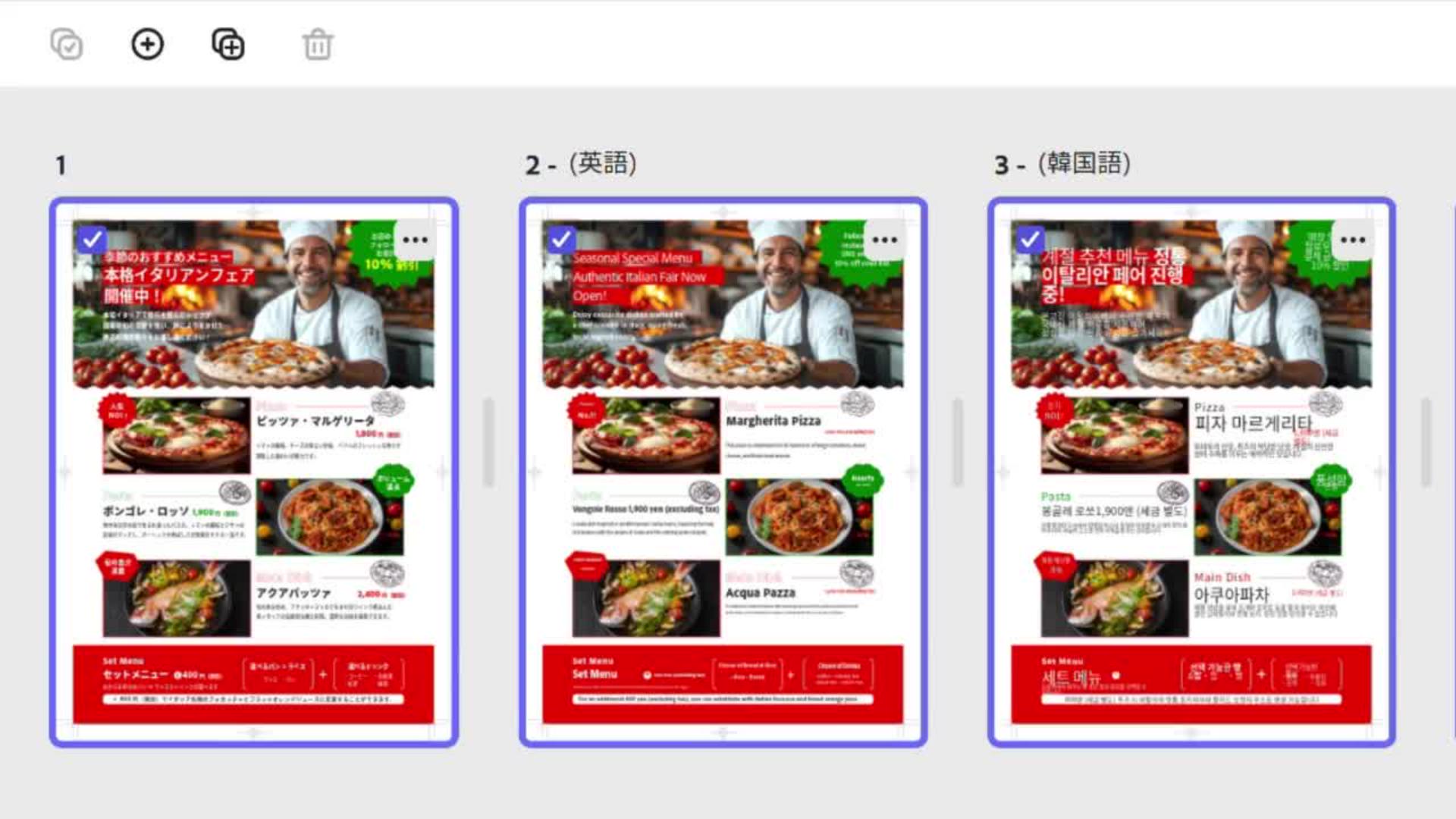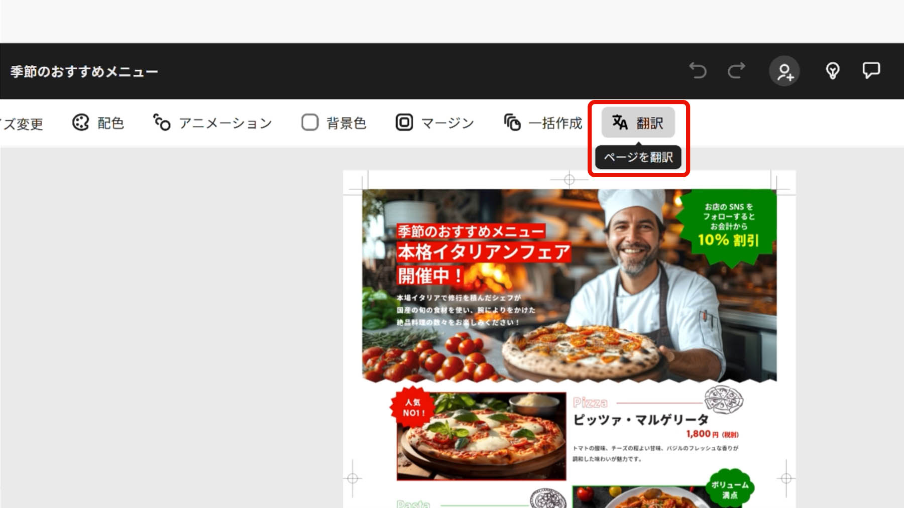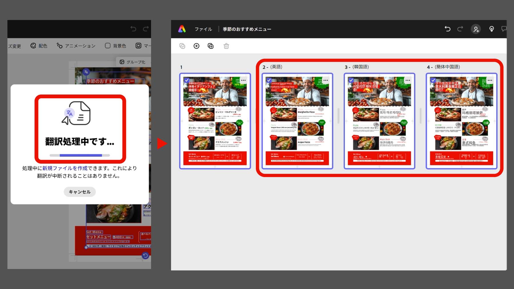 Adobe Express の翻訳機能を使用すれば、日本語で作成した PDF の内容を多言語に簡単に翻訳することができます。飲食店のメニューを例に多言語に翻訳して変更してみましょう。